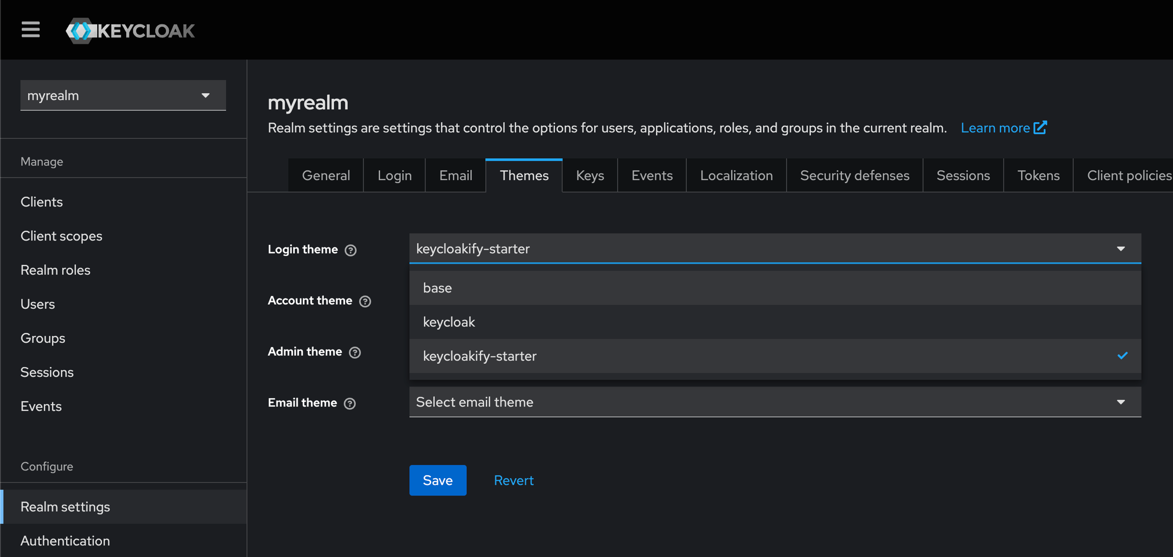 Let's see how to enable your theme once you have sucessfully imported it in your Keycloak instance.