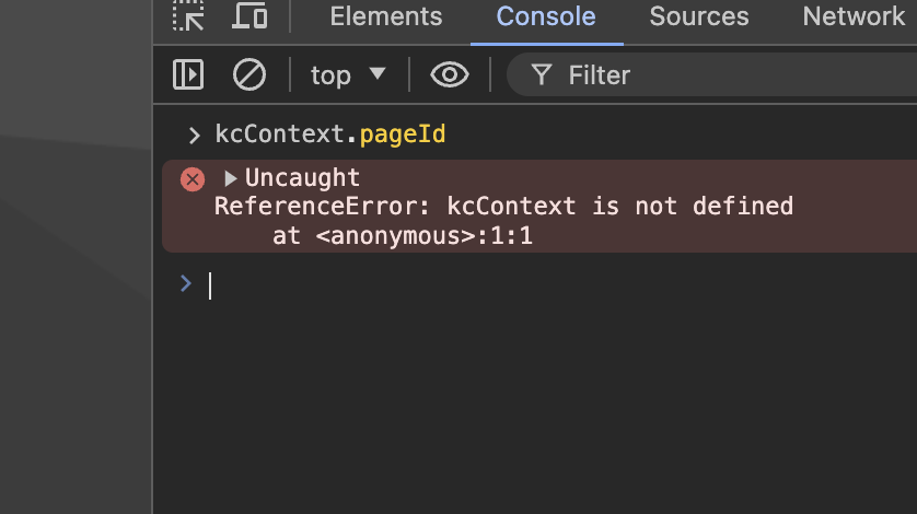 <figure><img src="https://content.gitbook.com/content/N2jP04ve5XD0mhCzbqnp/blobs/Ox2UWU3Qwo8ap7gQzpgy/image.png" alt=""><figcaption><p>No kcContext defined on the global</p></figcaption></figure>