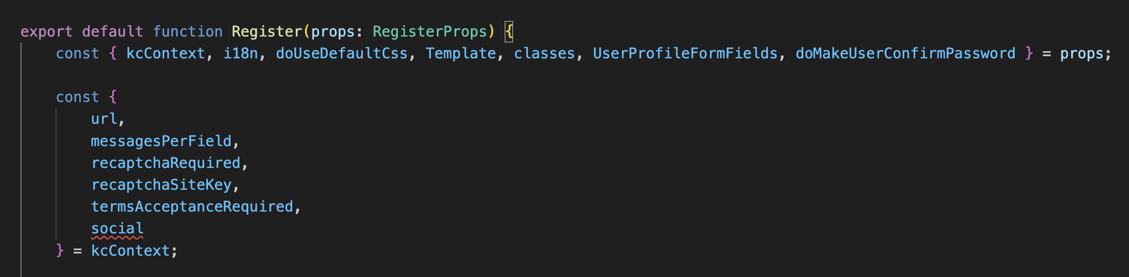 <figure><img src="https://github.com/user-attachments/assets/012aa574-868c-4f7b-a13e-220f1f12ce2a" alt=""><figcaption><p>Declaring that there is a social property on the kcContext of the register page and this social object is of the same type as the one present on the login page.</p></figcaption></figure>
