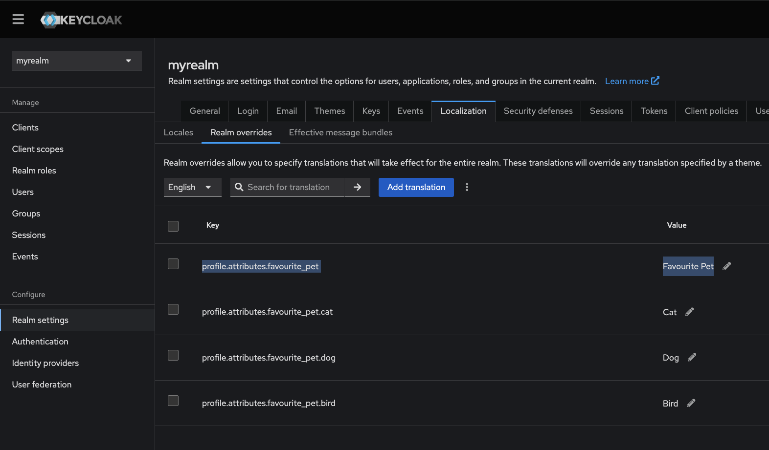<figure><img src="https://content.gitbook.com/content/N2jP04ve5XD0mhCzbqnp/blobs/7jsK3XxBoTQlqro9K9pC/image.png" alt=""><figcaption><p>A translation for the message key "profile.attributes.favourite_pet" has been defined for the English language: "Favourite Pet"</p></figcaption></figure>