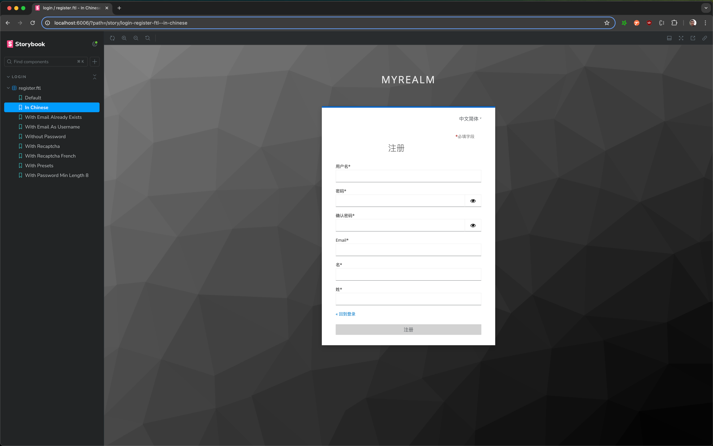 The idea of Storybook is to easily let you see the pages in different configuration without having to reproduce the full login/register process in a real Keycloak. Keycloakify provide a default mock context for every pages, the stories let you partially override some specific part of this default mock to reflect pages in different configurations. For example, if you want to create a story that show the register page in chinese you would add this: